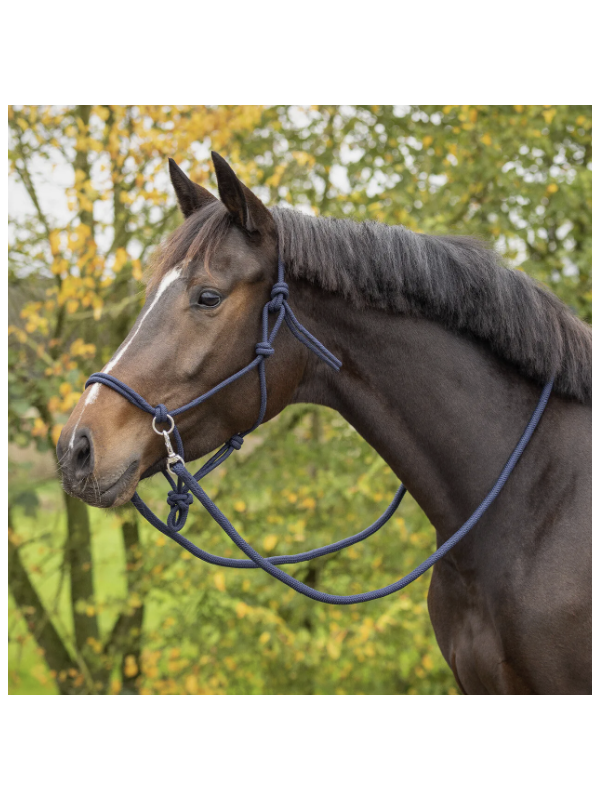 Les licols à corde peuvent être utilisés de plusieurs façons, par exemple pour le travail au sol ou l'équitation sans mors. Ce licol comporte deux anneaux métalliques et est fourni avec une longe épaisse utilisée comme rênes.