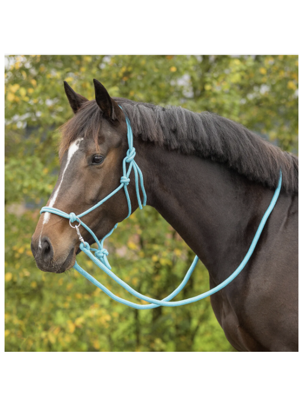 Les licols à corde peuvent être utilisés de plusieurs façons, par exemple pour le travail au sol ou l'équitation sans mors. Ce licol comporte deux anneaux métalliques et est fourni avec une longe épaisse utilisée comme rênes.